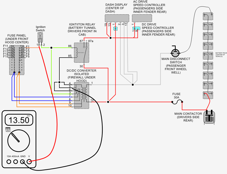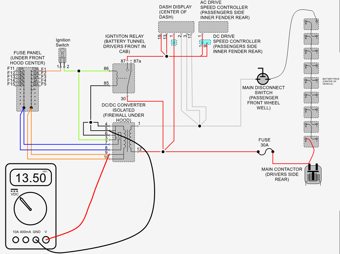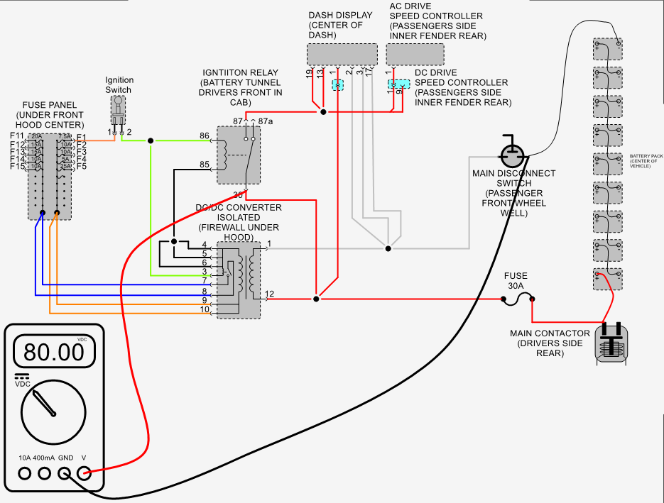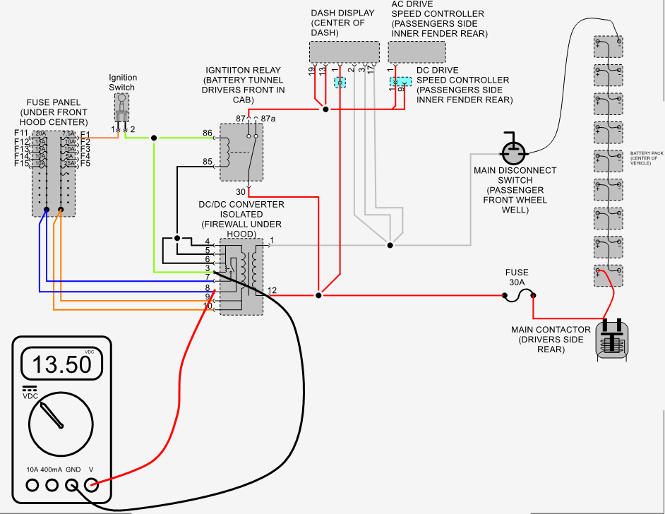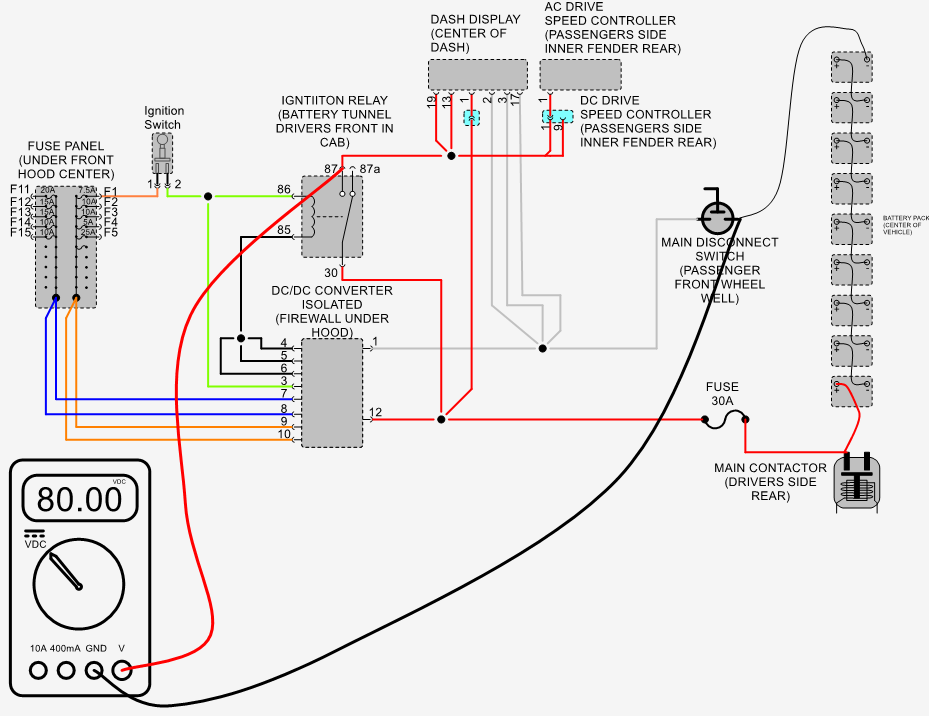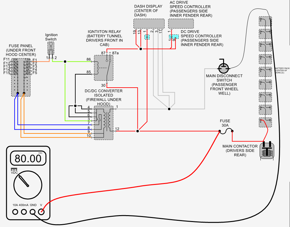 Measure voltage between B- of main battery pack and pin #87 of ignition switch relay with ignition switch in the on position Should measure pack voltage typically about 80 volts.