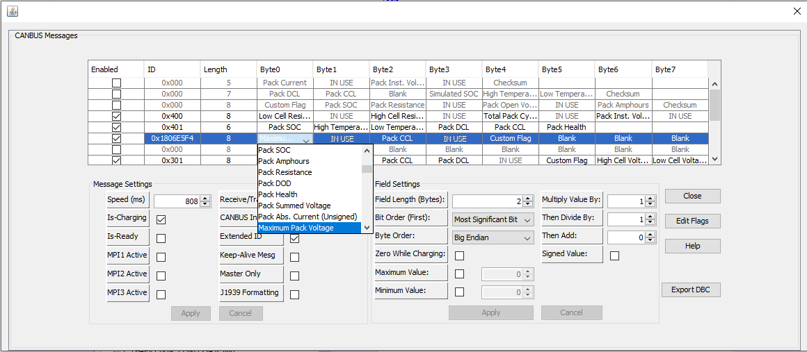 In the Byte0 column of the 0x1806E5F4 ID row click on the Maximum Pack Voltage. Dropdown will appear but do not change the setting. Just need the cell clicked on.