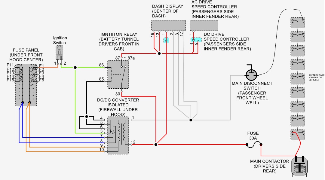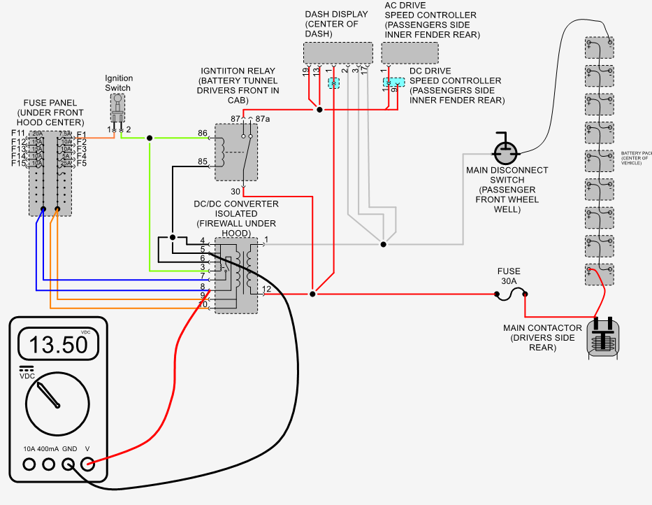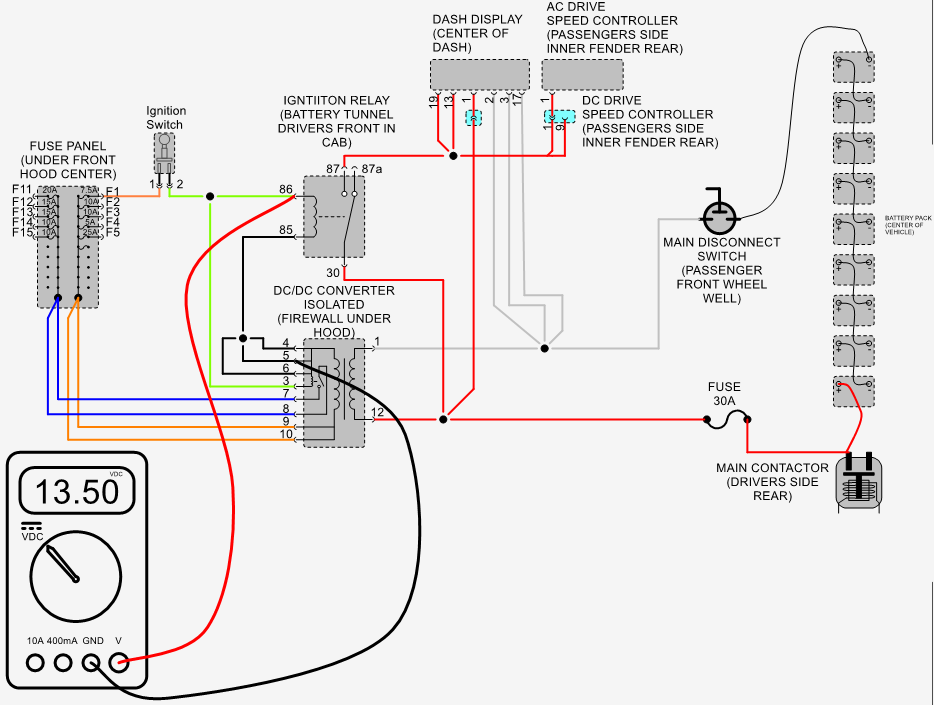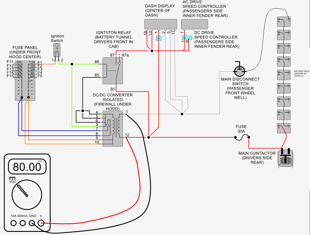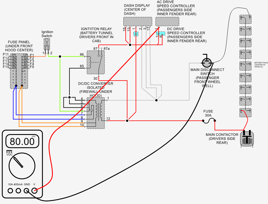 Measure voltage between B- of main battery pack and pin #87 of ignition switch relay with ignition switch in the on position Should measure pack voltage typically about 80 volts.