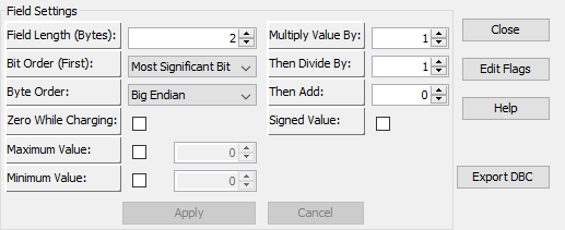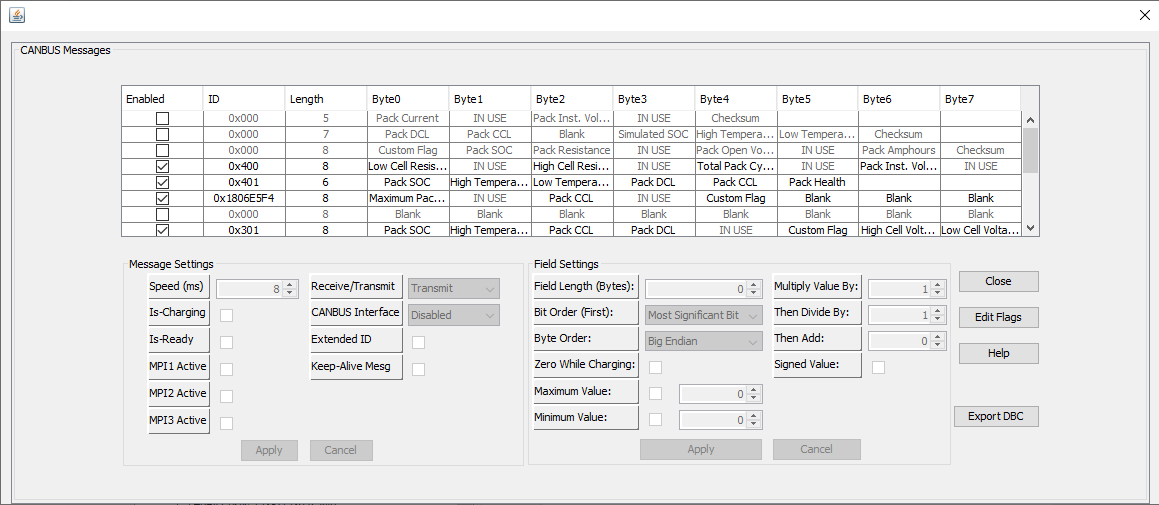 In the Byte0 column of the 0x1806E5F4 ID row click on the Maximum Pack Voltage. Dropdown will appear but do not change the setting. Just need the cell clicked on.