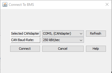 Please note if you are programming a new BMS or the BMS was sent in for repair you will need to initially connect at 500 kBit/sec. After programming is completed, you will be automatically disconnected. If you need to reconnect you will need to change to 250 kBit/Sec.