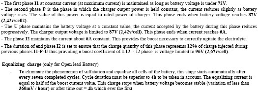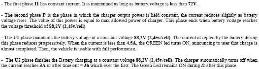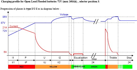 The charger is designed to adapt automatically to all battery discharge states and allows all types of partial charge cycles or "opportunity charging". Meaning the vehicle can be charged at anytime no mater what the state of charge is.