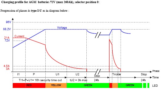 IV. Significant over voltage: after about 1 minute, the charger will automatically try to re-start. If mains voltage does not come back into the given tolerances, the charger will stay in default state and will be able to re-start only after a mains disconnection (mains voltage in the given range).