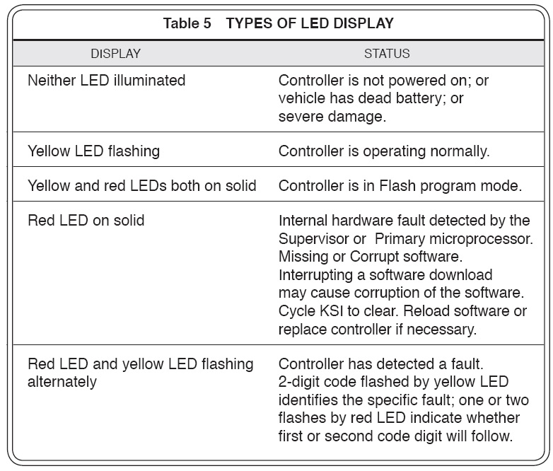 The following troubleshooting chart(Table 7) provides the following information on all the controller faultsincluding the ways to identify each fault, possible causes, and the “set” and“clear” conditions associated with each. Whenever a fault is encountered and no wiring or vehicle fault can befound, shut off the key switch and turn it back on to see if the faultclears. If not, shut off the key switchand remove the 35-pin connector to the controller. Check for connector corrosion or damage,clean it if necessary, and re-insert it.