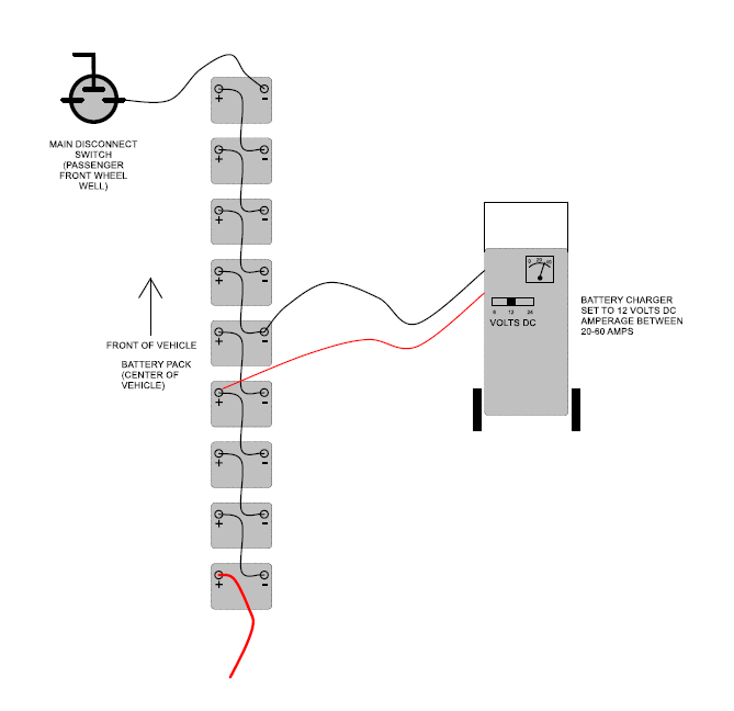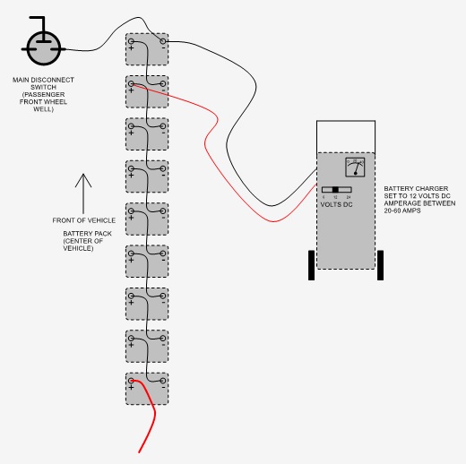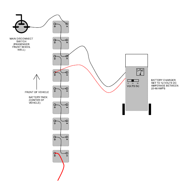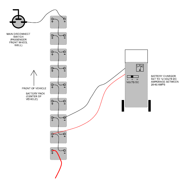 These are the instructions on how to recharge battery pack when pack voltage is too low. Main vehicle battery charger has a low voltage threshold. Once battery pack drops below this threshold the battery charger will not operate. There are two different chargers. The older version which was manufactured by Lester is a large silver box. This version charger low voltage threshold is about 40 volts DC. The newer style charger is manufactured by IES and is a black unit about 1 square foot in size. This version charger low voltage threshold is about 20 volts DC. This voltage is measured by reading the voltage over the entire battery pack. Negative at the front positive at the rear.