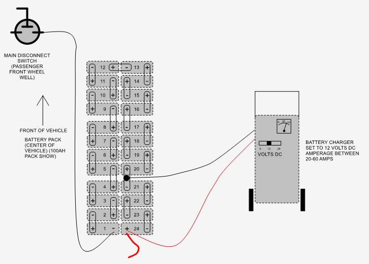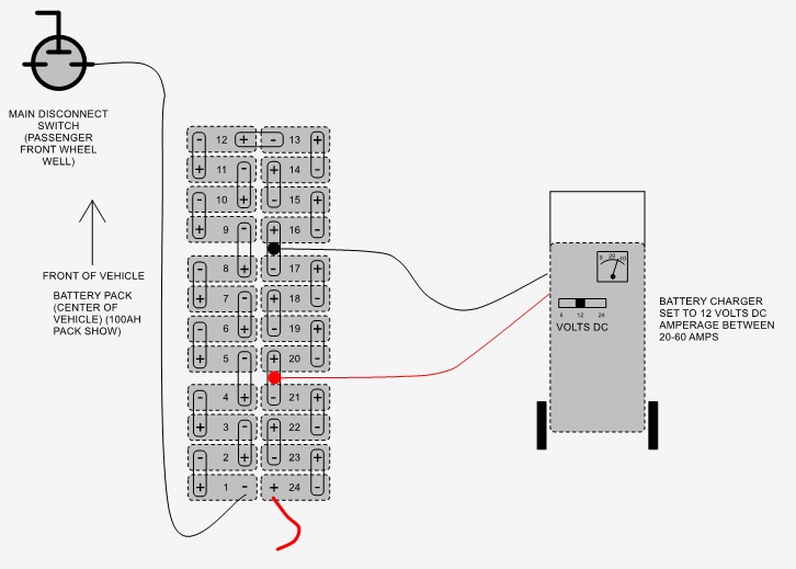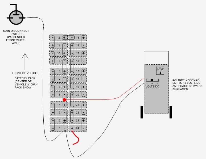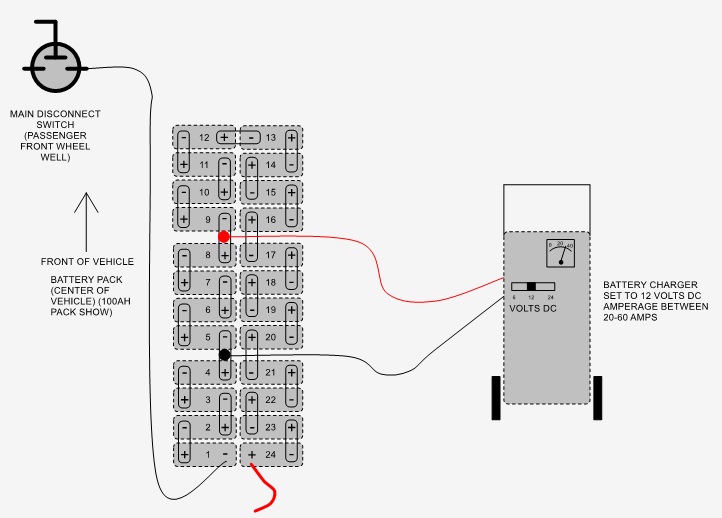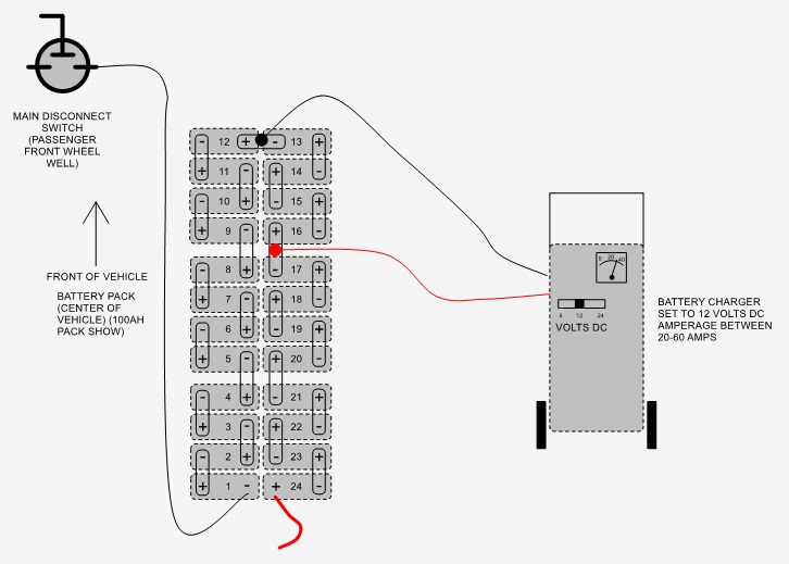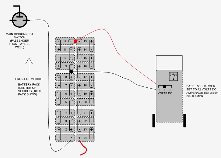 These are the instructions on how to recharge battery pack when pack voltage is too low. Lithium battery management system (BMS) has a low voltage threshold. Once any single cell drops below 1/2-volt threshold the BMS will not allow the battery charger to operate. This voltage is measured by reading the voltage over each of the individual 24 cells within the battery pack. If you have the lithium diagnostic cable and a computer, you can connect it to the diagnostic port above the accel pedal and it will show you the voltages of each cell.