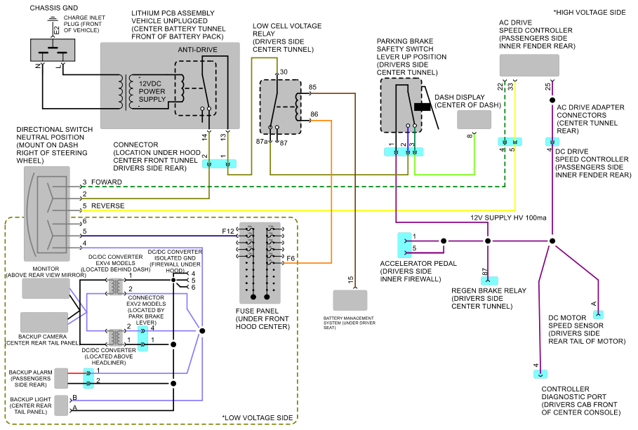 Measure between pin# 2 of directional switch and main negative of battery pack (drivers side rear). Should measure 12VDC with ignition key on and parking brake released. If so, see test #9. If not, you have a wiring/connection issue between lithium PCB assembly and directional switch.