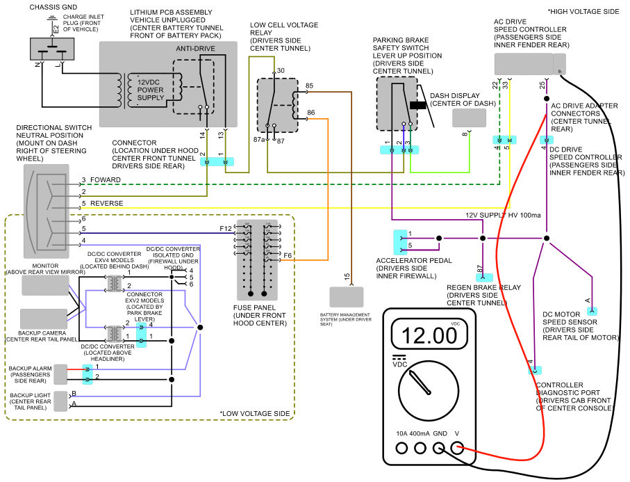 Measure between pin# 87a of low cell voltage relay and main negative of battery pack (drivers side rear). Should measure 12VDC with ignition key on and parking brake released. If so, see test #5. If not, you have a wiring/connection find and fix.