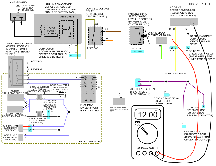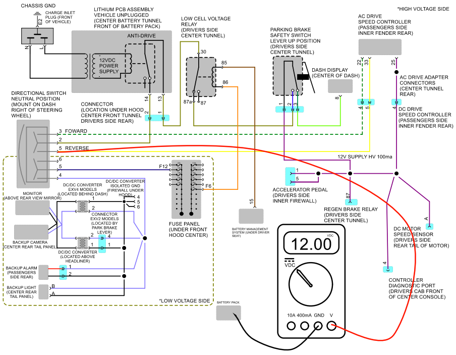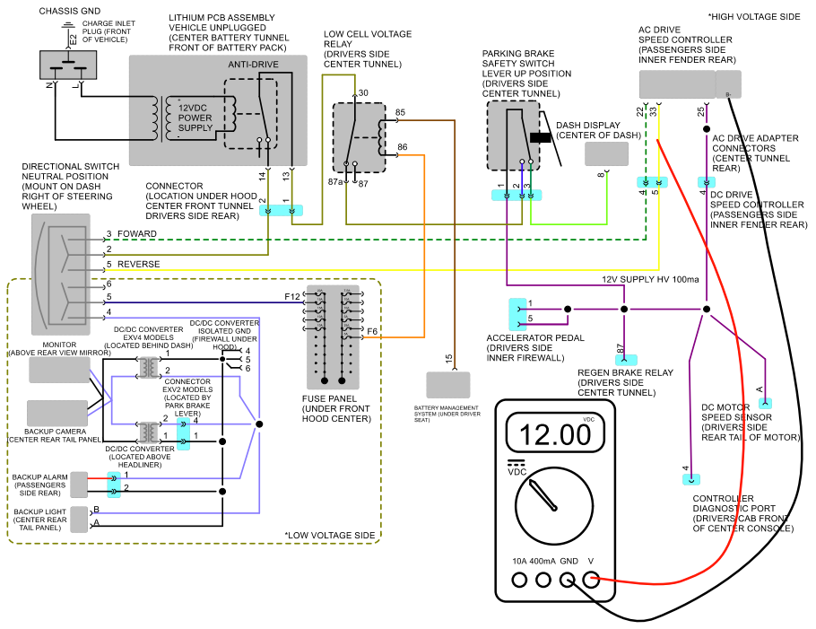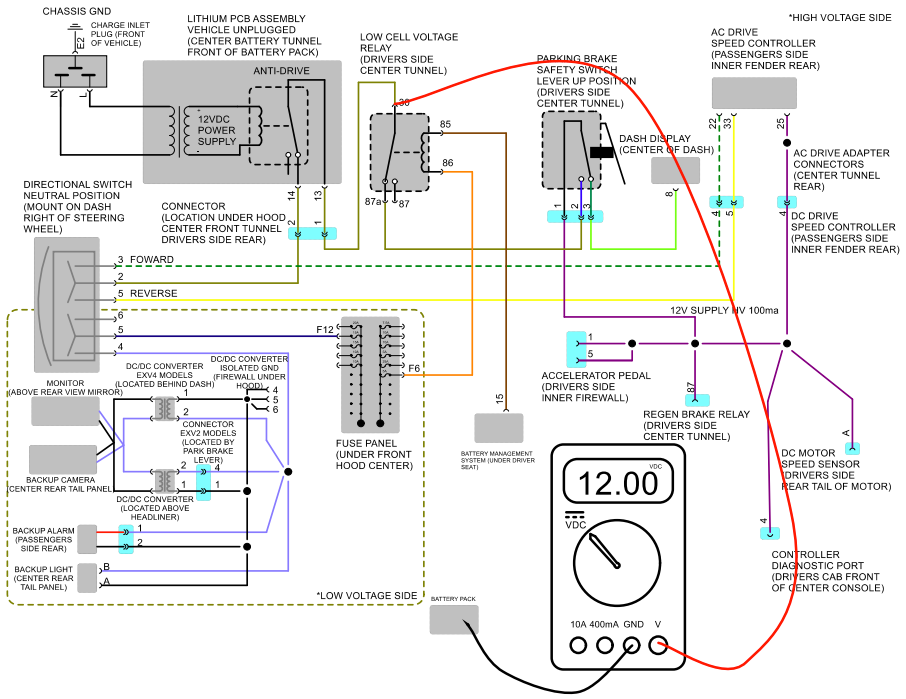 Measure between pin# 30 of low cell voltage relay and main negative of battery pack (drivers side rear). Should measure 12VDC with ignition key on and parking brake released. If so, see test #6. If not, see test #5-1.