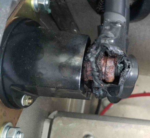 Take a look at the back side of the disconnect switch. If you see any signs of heat such as the rubber battery cable boots being melted or the cable and post being heavily rusted, then you will want to replace the disconnect switch. It is part# U5801A-N. This is a direct replacement. To access the back of the disconnect switch, open front hood and pull up on center tunnel cover which is just velcroed down. If equipped with air conditioner you will not have this cover. The disconnect switch is mounted to the passenger's side of the tunnel. It has two large battery cables running to it. Here is an image of what a bad disconnect switch might look like.